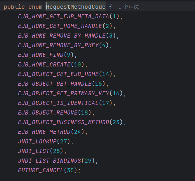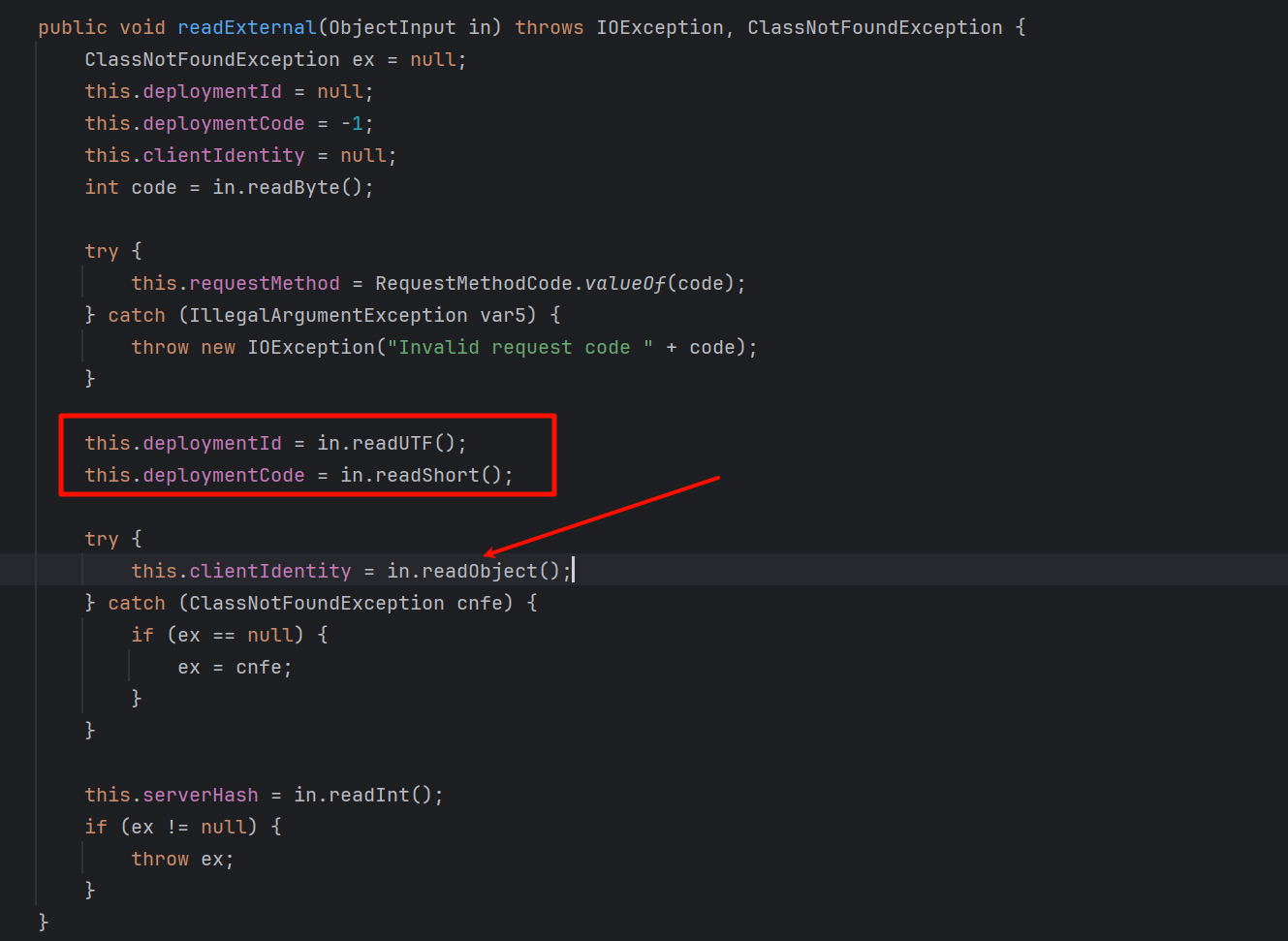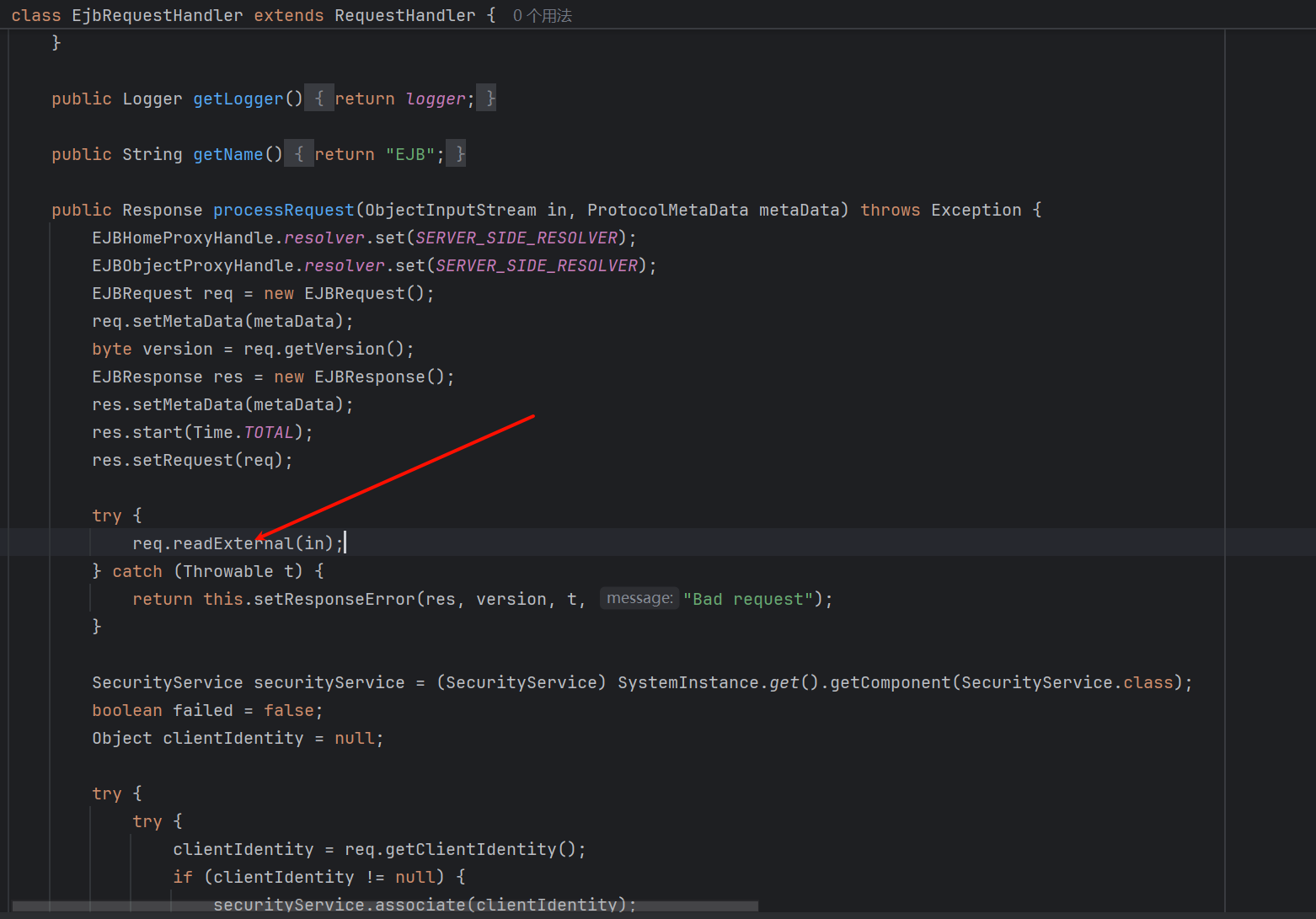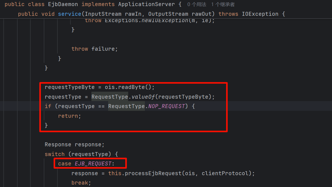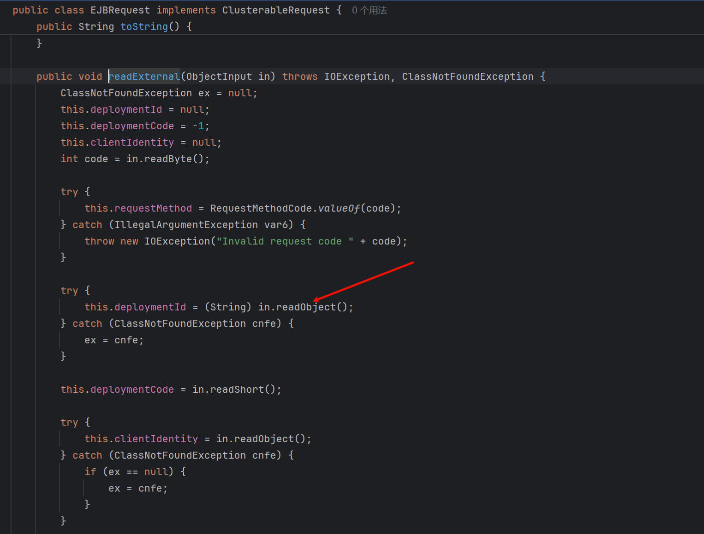 根据上文的简单分析,最终来到 com.tongweb.tongejb.client.EJBRequest.readExternal(),再次读取一个字节作为 RequestMethodCode,并且仅需满足为合法的 RequestMethodCode