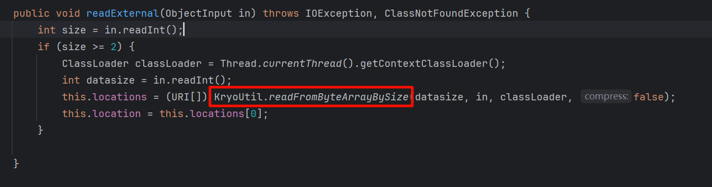 第二点,在 com.tongweb.tongejb.client.ServerMetaData.readExternal() 方法中,入口点在 (URI[])KryoUtil.readFromByteArrayBySize(datasize, in, classLoader, false); 中: