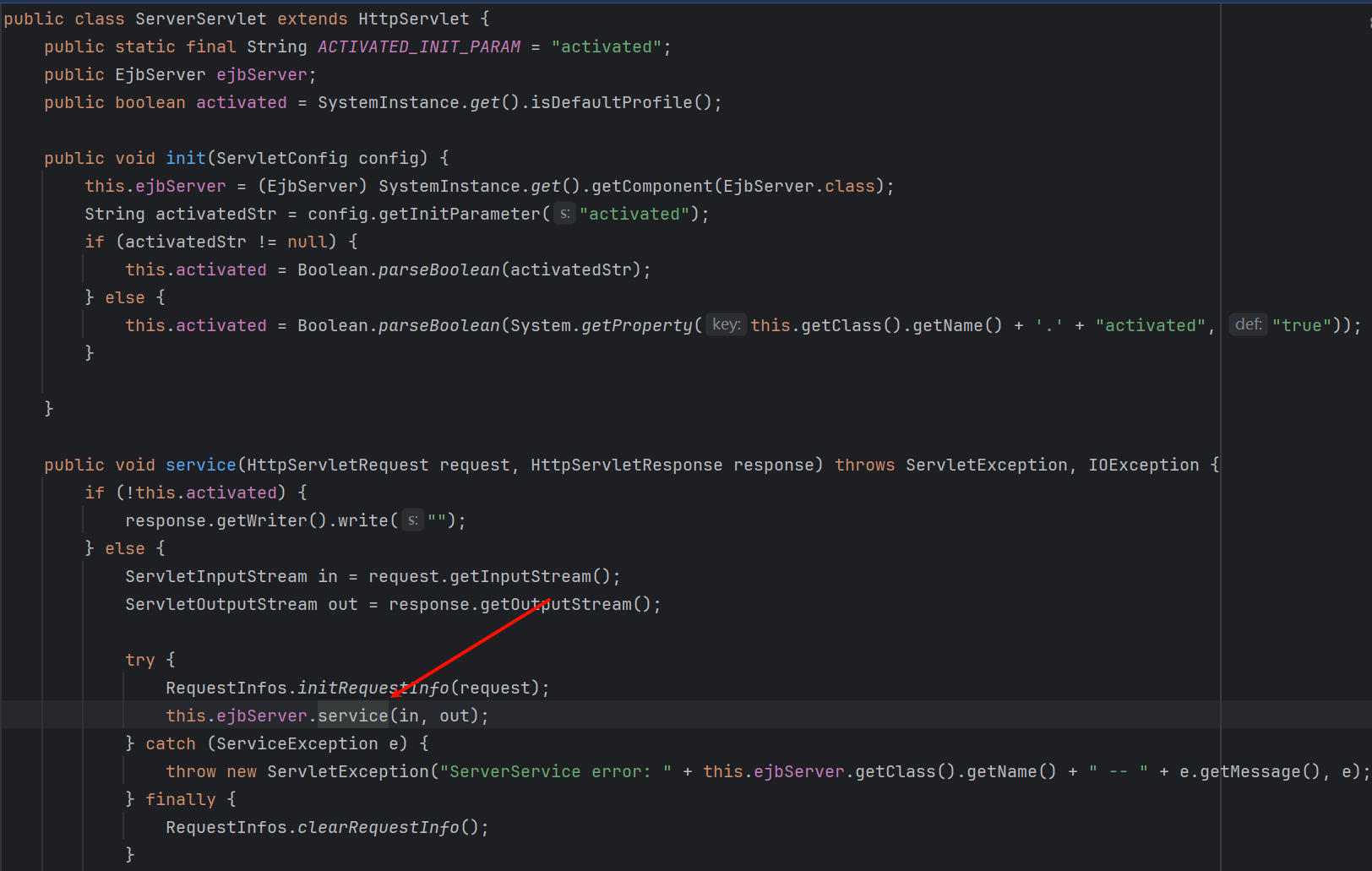 进入 com.tongweb.tongejb.server.ejbd.EJBServer.service() 方法: