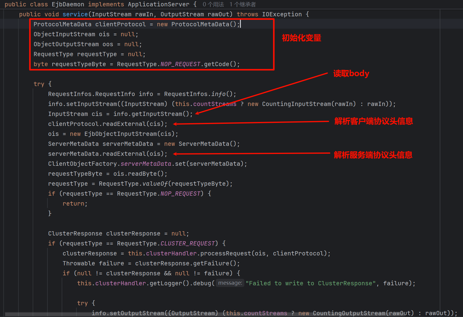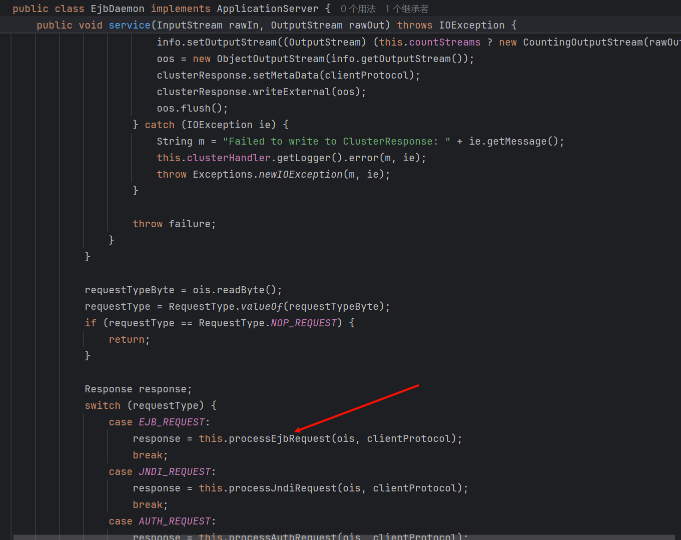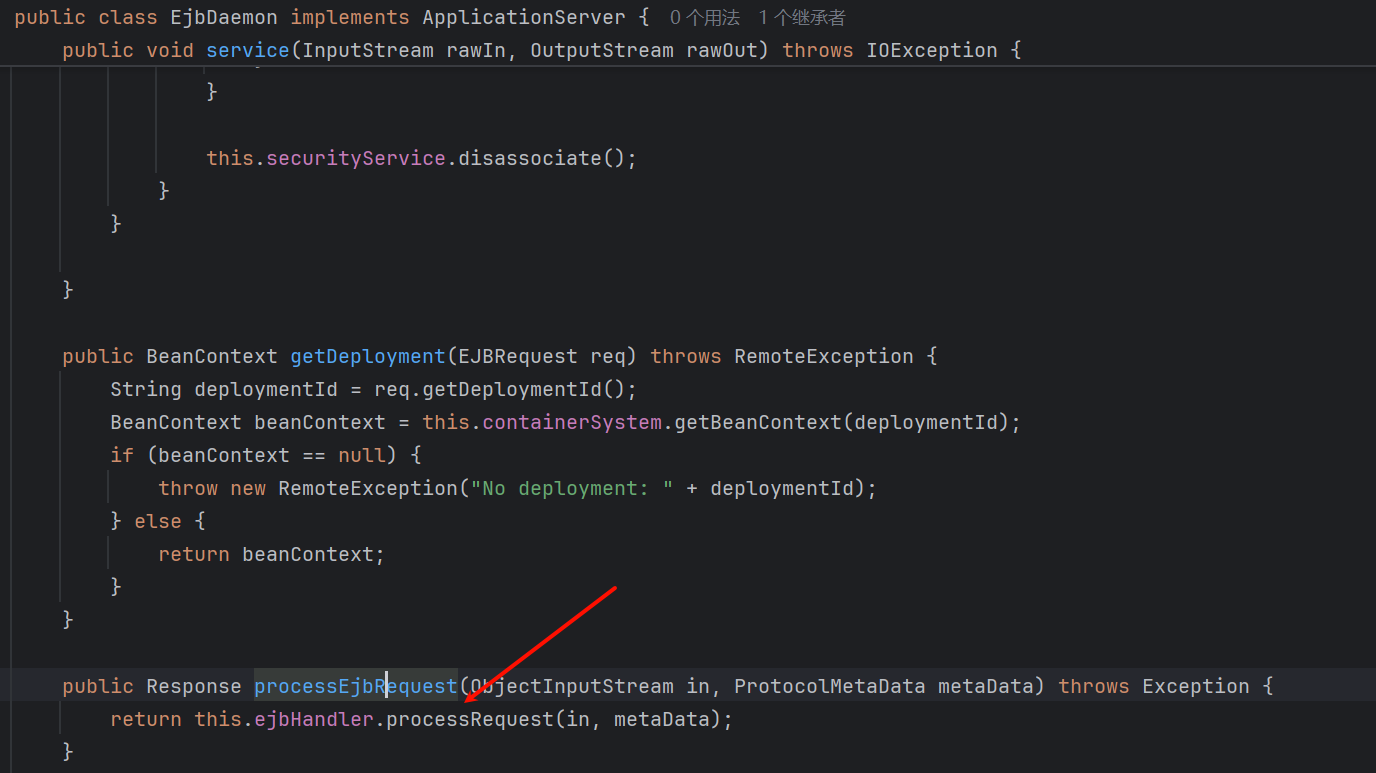 进入 com.tongweb.tongejb.server.ejbd.EjbDaemon.processEjbRequest() 方法: