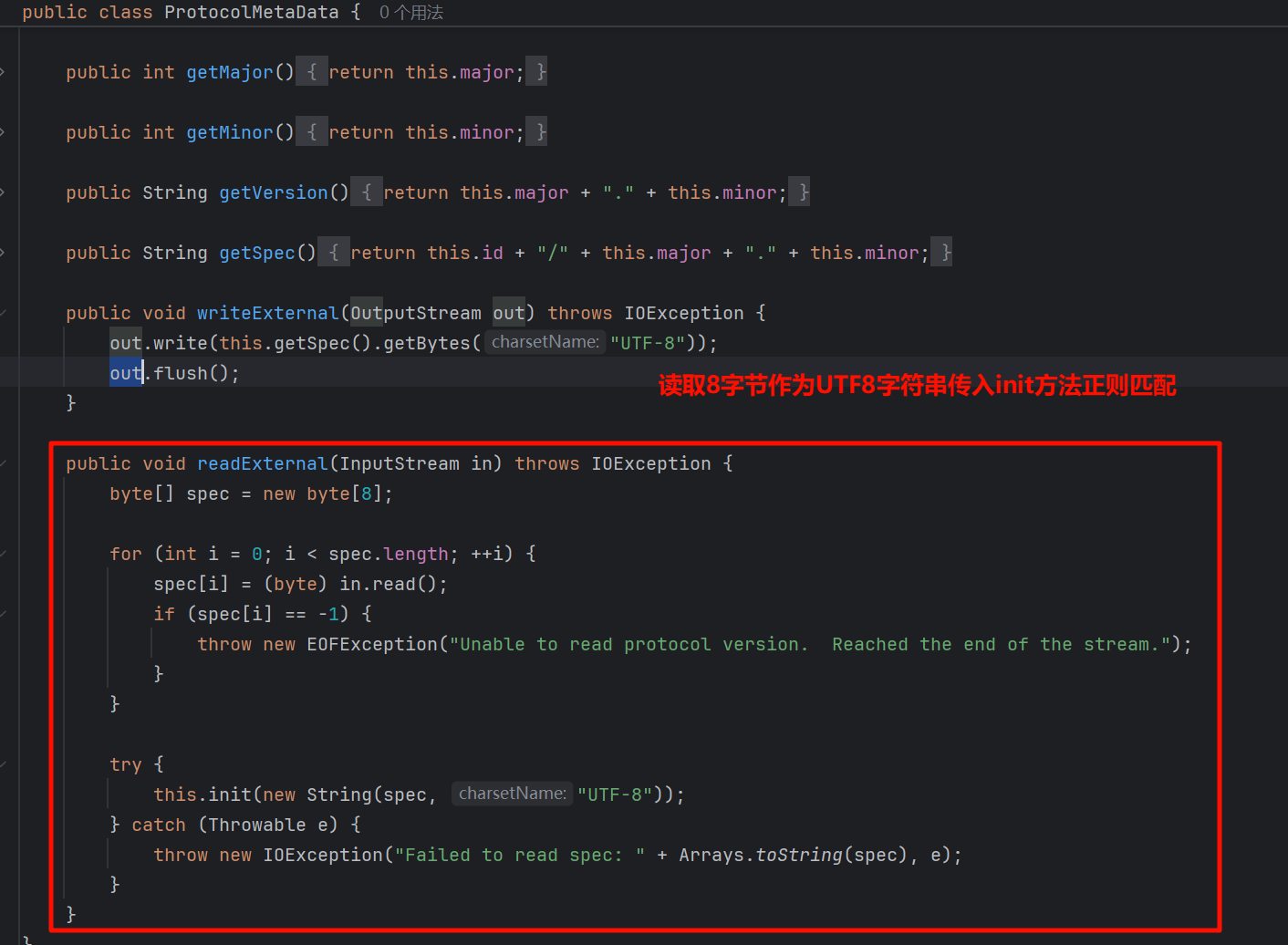 经过分析,存在一个反序列化入口点,并且根据代码中解析协议的顺序,构造合适的客户端协议头:
