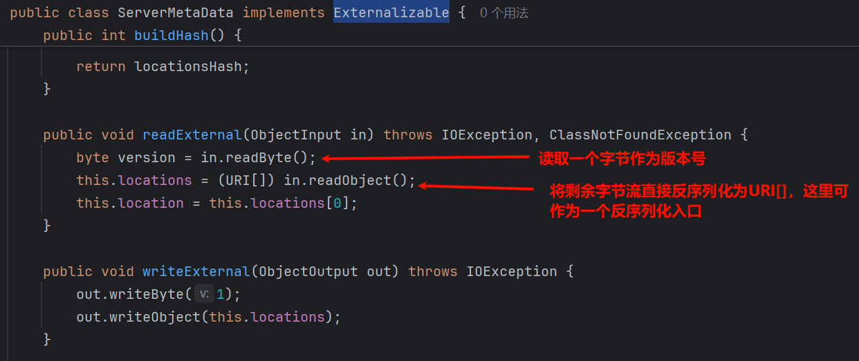obout.writeInt(1); // size 跳过第一个ServerMetaData.readExternal的if防止异常,小于2即可