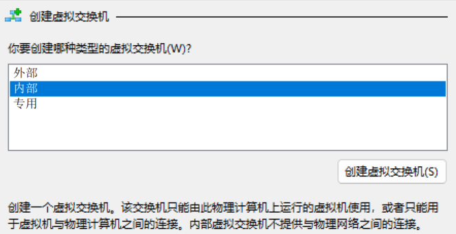 创建虚拟交换机,选择内部交换机,并填入名称,这里填入的是仅主机: