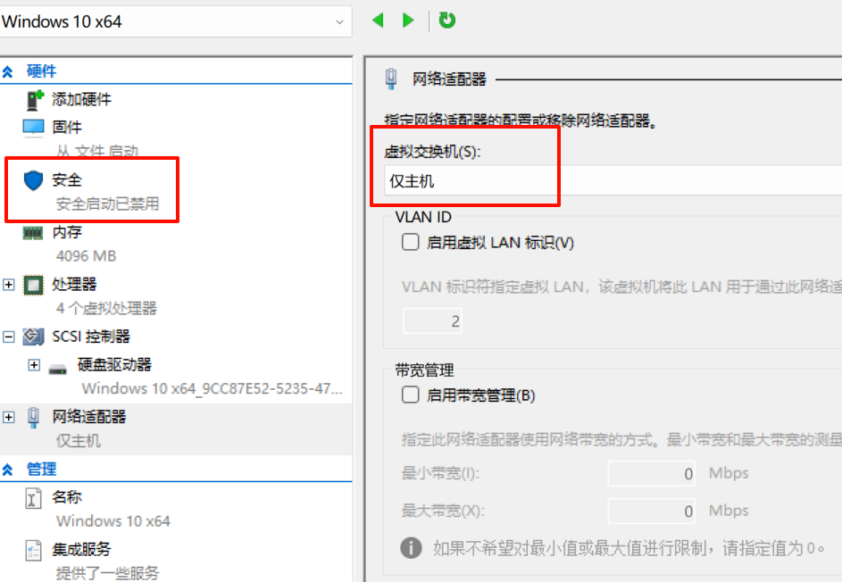 并将其添加至目标靶机的网络适配器中,并将安全启动关闭: