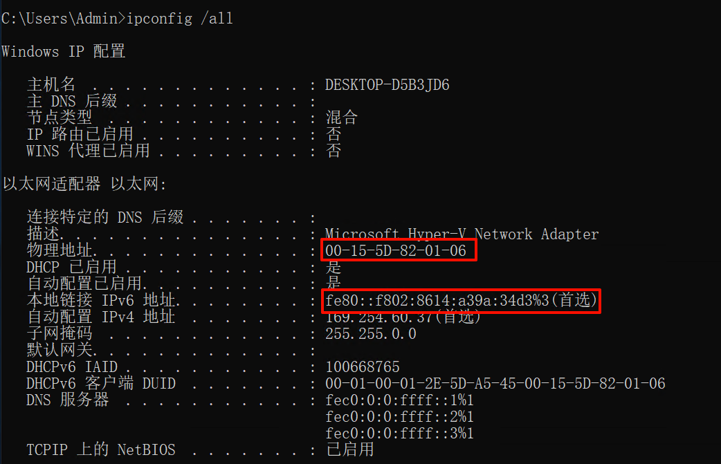 开机之后执行 ipconfig /all 查看 IPv6 和 MAC 地址: