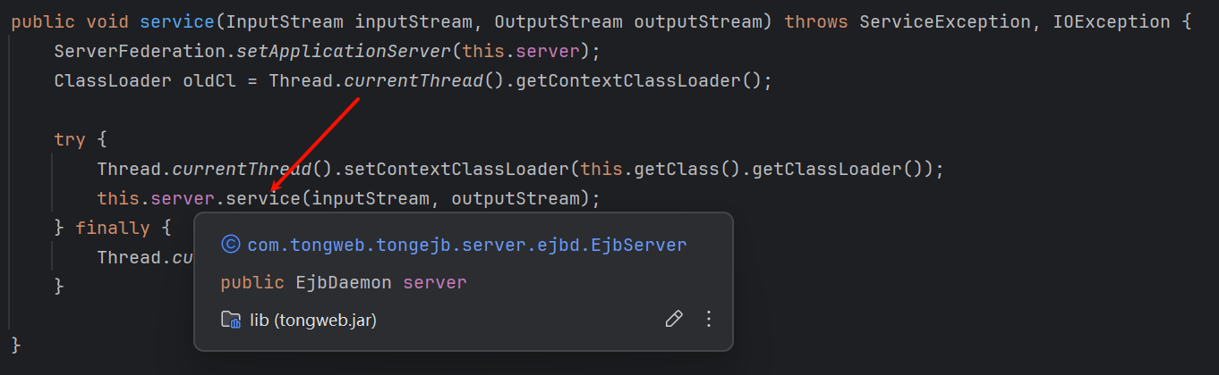 进入 com.tongweb.tongejb.server.ejbd.EJBServer.service() 方法: