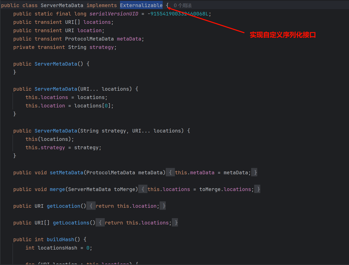 其中 readExternal、writeExternal 为自定义实现的反序列化方法和序列化方法,用于业务需求的灵活序列化传输,存在一个入口点: