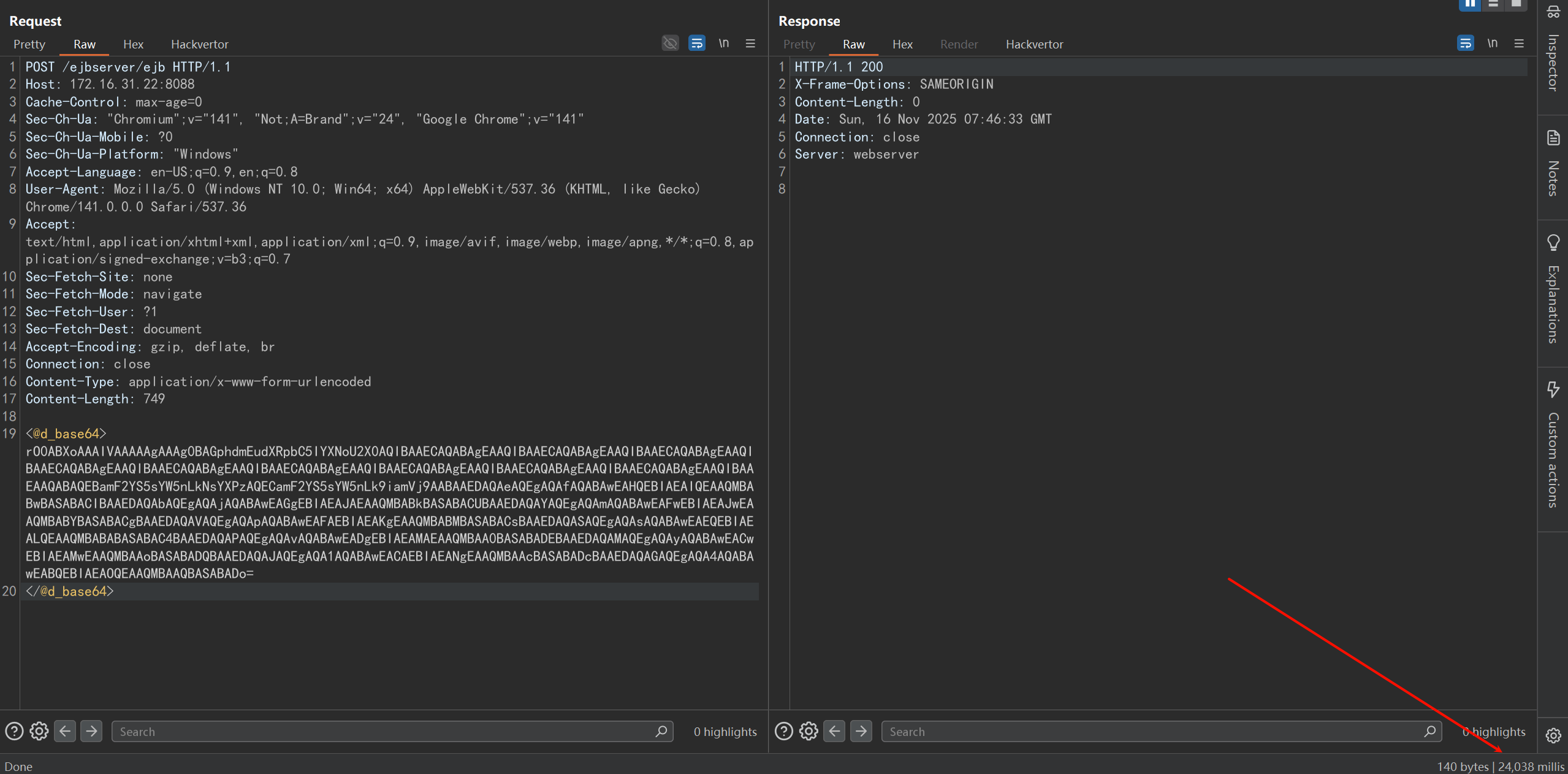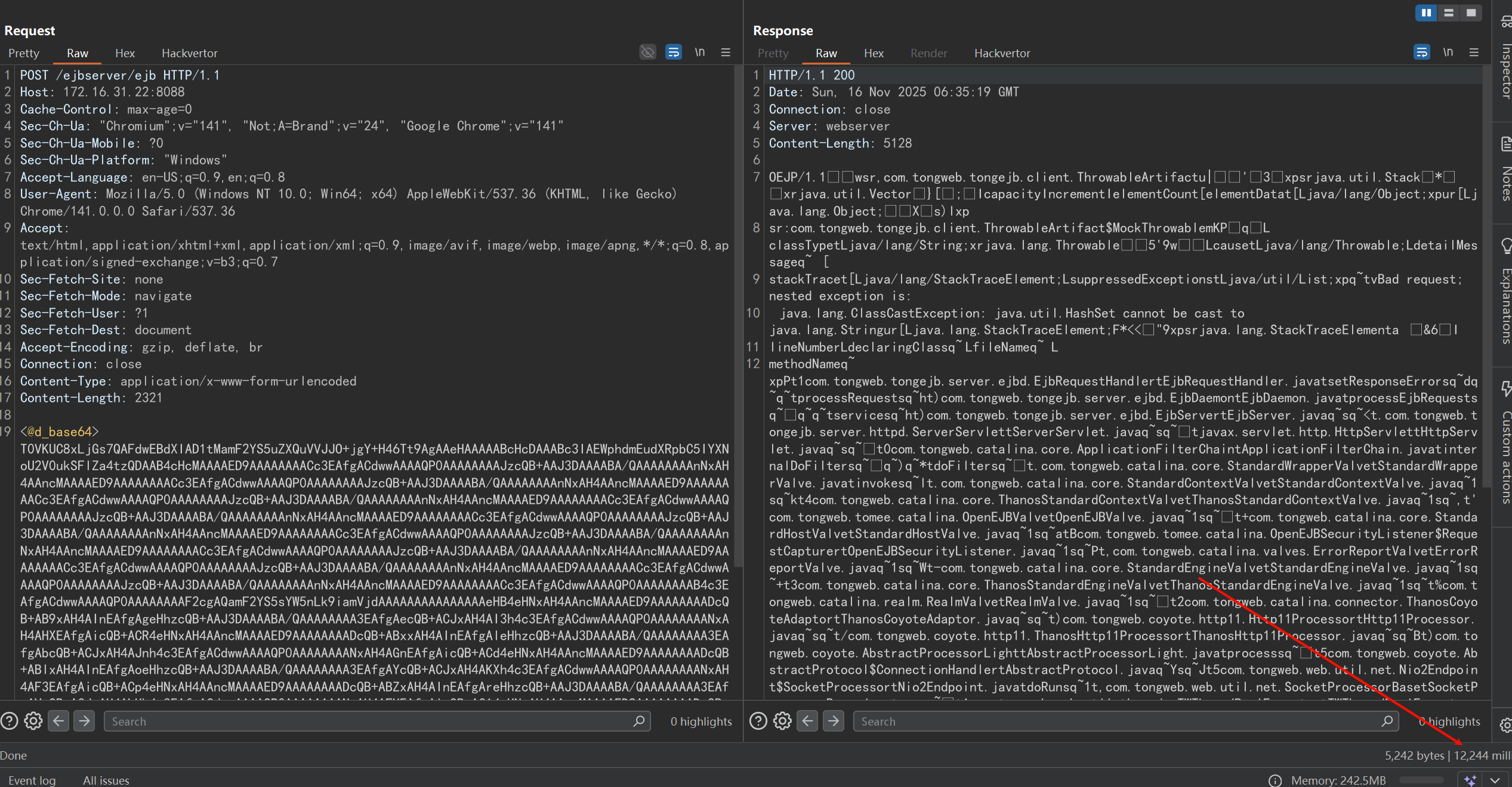 TongWeb ejb 服务没有校验请求的数据,直接对来源的数据进行反序列化,而默认情况下,http 服务(8088 端口) /ejbserver/ejb 接口会转发至 ejb 服务(5100 端口)的相同接口,攻击者可发送特定的数据包,造成反序列化漏洞,其中可利用的反序列化链主要有: