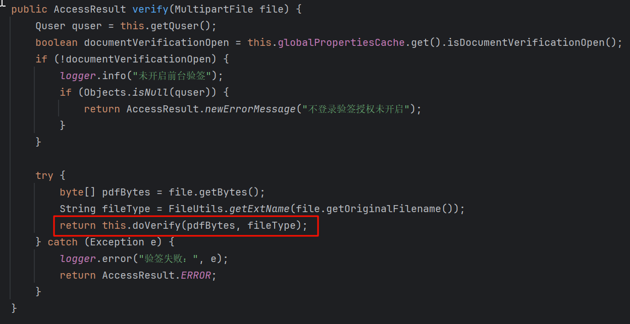 判断前台校验是否开启,默认开启,将文件字节数据及文件后缀传入 doVerify 方法,方法体如下:
