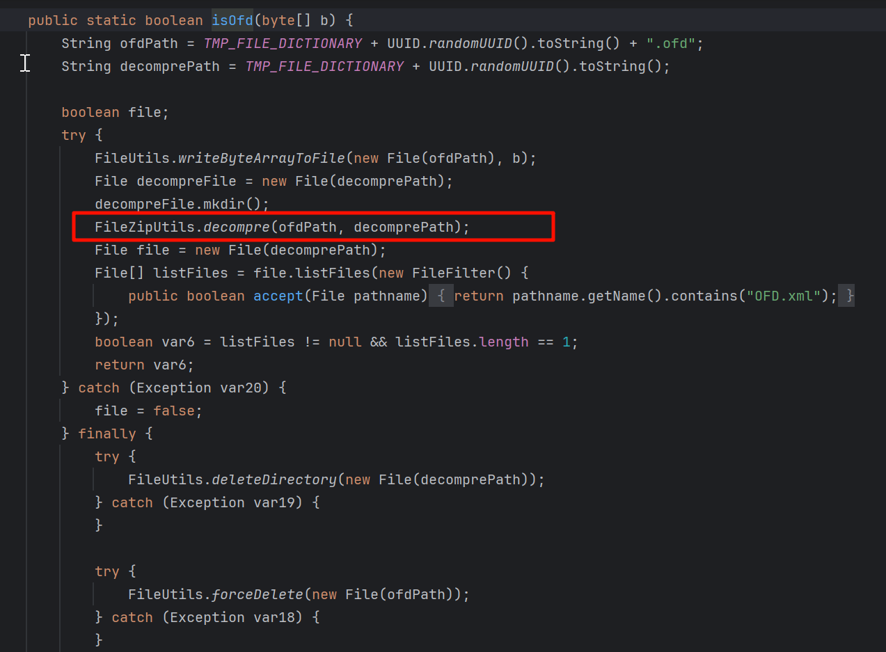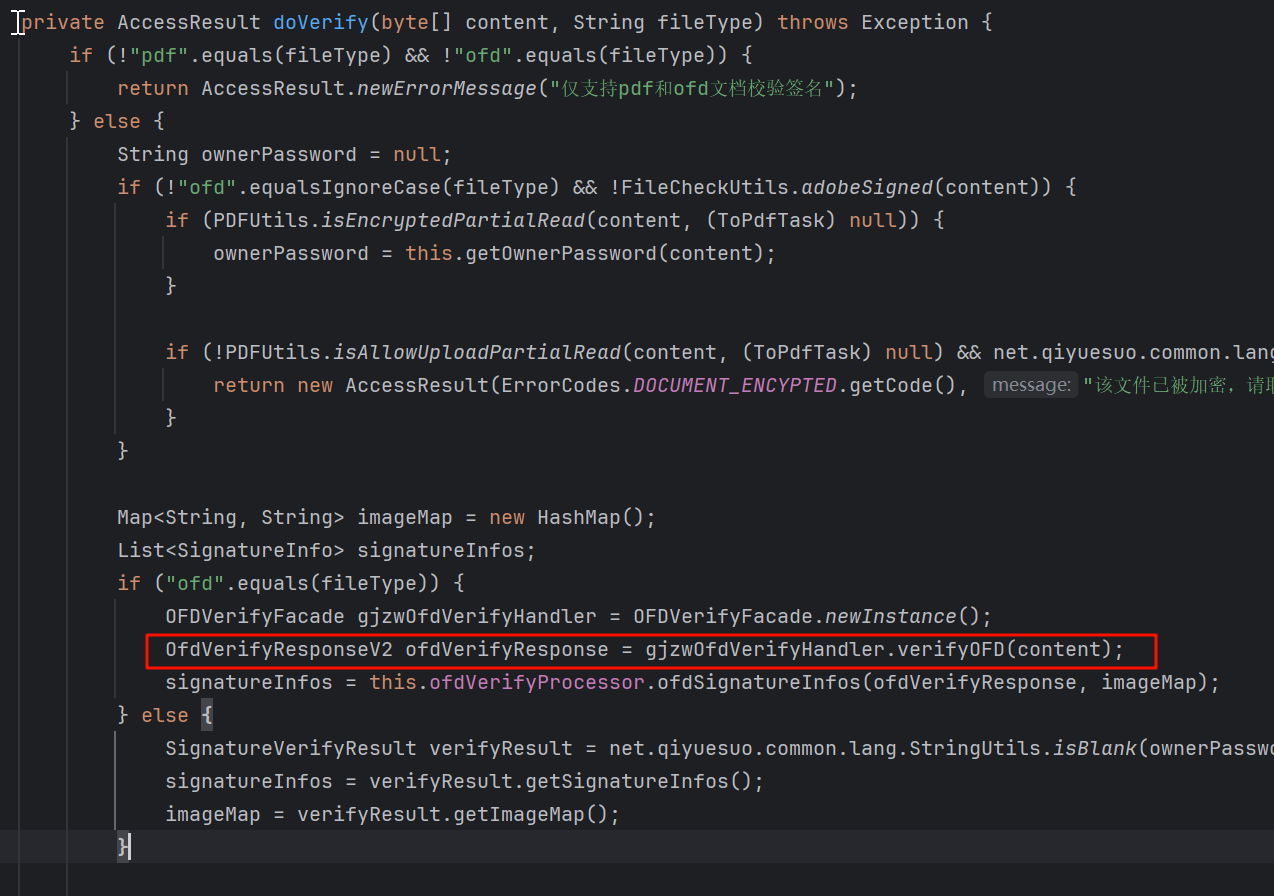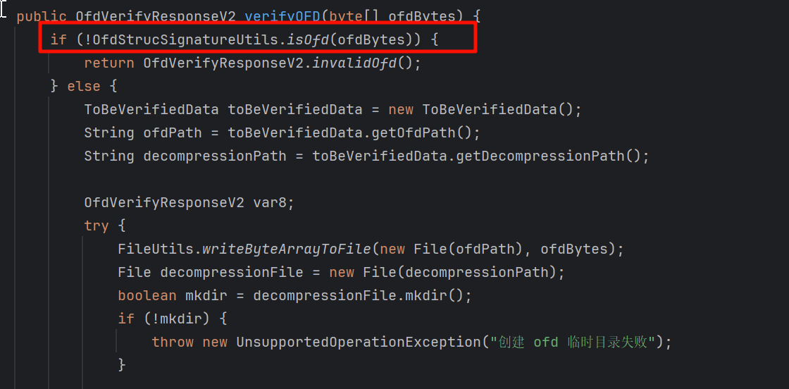 验证 pdf 和 ofd 后缀,并分别对 pdf 和 ofd 进行不同的验证逻辑,漏洞触发点在 ofd 的验证逻辑中,将 ofd 文件字节数据传入到 isOFD 方法中,方法体如下: