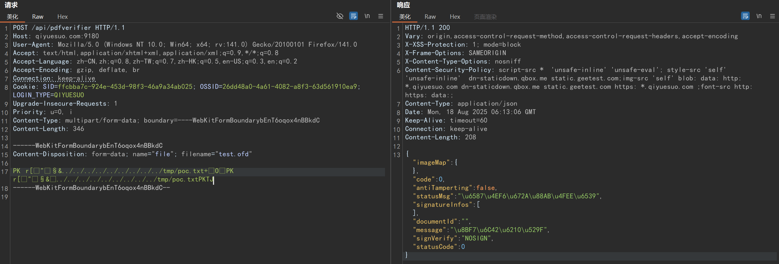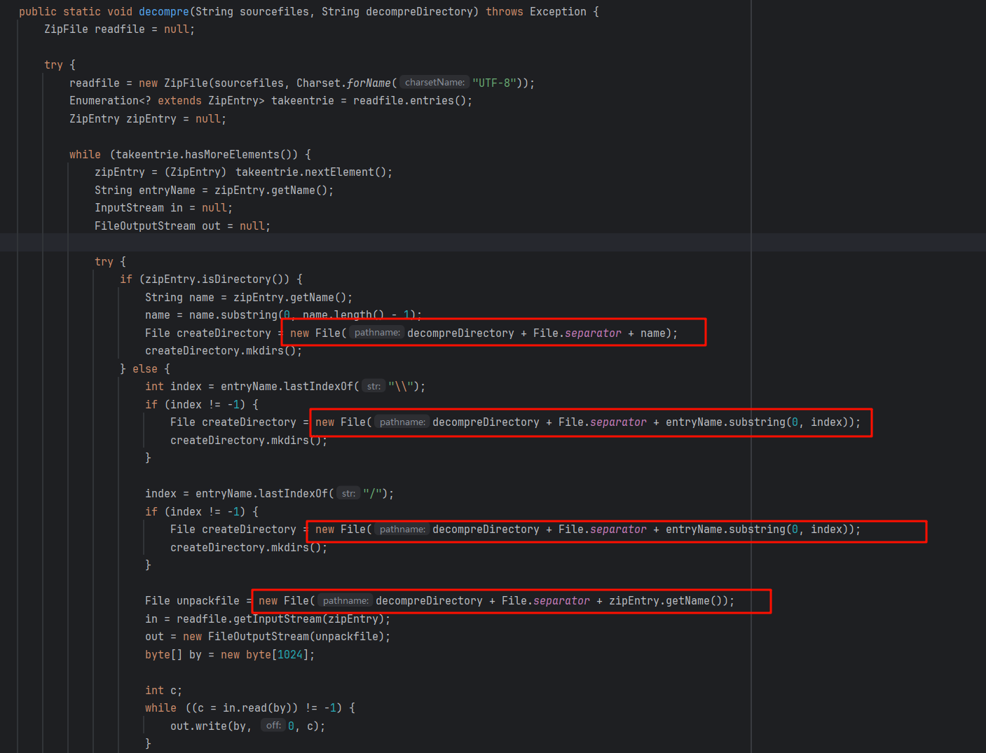 对 ofd 文件以 zip 方式进行解析,并读取每个文件及目录进行解压,解压目录通过 decompreDirectory + name 进行拼接,存在任意目录穿越,可通过构造恶意 ofd 文件实现任意文件上传。
